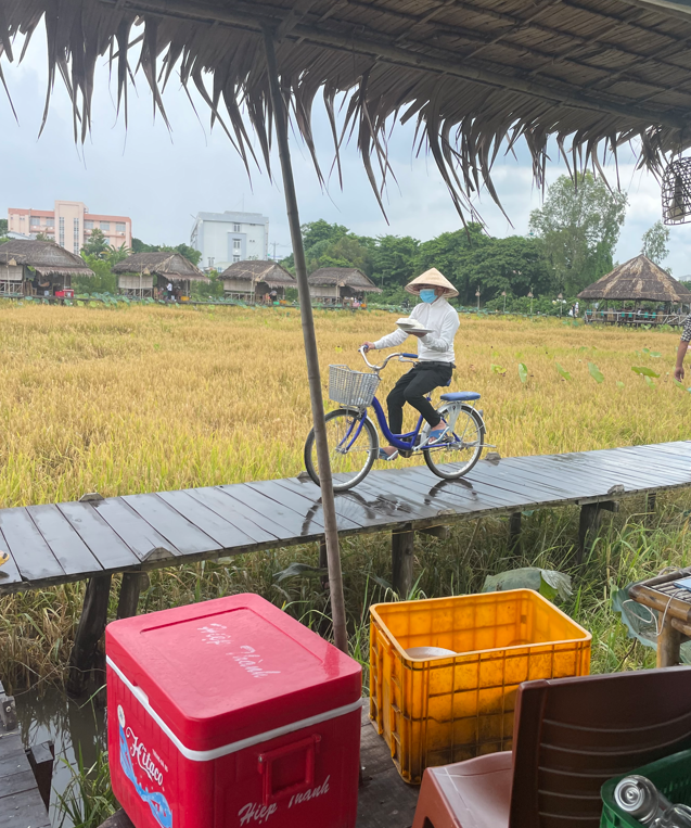 Đường ra chòi trên đầm sen và ruộng lúa nên là mặt tre gỗ. Khu vực chòi ăn rộng bạt ngàn ôm thành hình tròn. Bọn mình bị ấn tượng bởi cách mà họ phục vụ đồ ăn ở đây vô cùng thú vị. Bởi vì không gian rộng, các chòi cách nhau cũng xa và cũng xa cả khu bếp nấu ăn nên phục vụ sử dụng xe đạp đạp tới chòi với một tay bê đồ khá khéo léo. Có bạn bê cả mâm to, bạn bê một đĩa cá, gà to không kém.