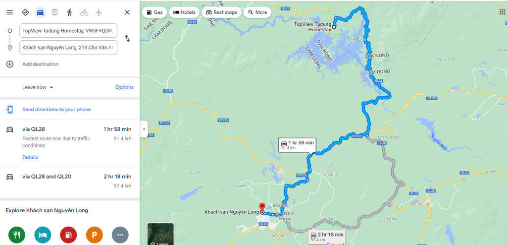 Trong tính toán đi từ Đăk Nông tới Đăk Lắk cả nhà muốn đi qua đèo Prenn của Đà Lạt để xem cung đường đèo có gì đẹp nên lại quyết định đi xuống Bảo Lộc ở một ngày rồi đi tiếp do từ đoạn hồ Tà Đùng tới tp Bảo Lộc cũng đã là 2 tiếng hơn đường đèo núi dốc QL28. Đường từ hồ Tà Đùng đi về Bảo Lộc nhìn chung rất bằng phẳng, đẹp (QL28) dù là đường đèo dốc, quanh co. Trên đường đi có rất nhiều đoạn view đẹp đáng để dừng lại để làm vài kiểu ảnh kỷ niệm (thậm chí cũng có rất nhiều đoạn có chỗ dừng chân) nhưng lúc đó là giữa trưa chiều, cả nhà cũng đã lăn ra ngủ trên xe, và vì cũng nắng nên cả gia đình mình cũng không dừng lại mà đi thẳng tới Bảo Lộc. Đang bon bon trên QL28 thì chị google maps lại chỉ rẽ vào hẻm 1182 Nguyễn Văn Cừ.