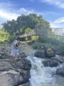 Tại khu du lịch cũng có bản sắc cầu treo qua suối của bản Đôn và rất nhiều lượt cầu treo dài đi qua sông Serepok đến bến thuyền để có thể đi thuyền lên phía trên và ngắm thác bảy nhánh. Tuy nhiên thì cầu treo tại thời điểm mình đến (20/6/2022) thì đã xuống cấp trầm trọng, rất nhiều thanh nan tre hai bên tay vịn đã rụng để lại nhiều chỗ hở lớn. Cầu khá cũ và tồi tàn rồi và cũng có ghi là tải trọng dưới 50 người nhưng mình nghĩ các bạn nếu muốn đi thì cứ từ từ mà đi, không nên lên cùng một lúc quá 10 người đồng thời nếu có trẻ con hãy luôn cầm tay, canh chừng.