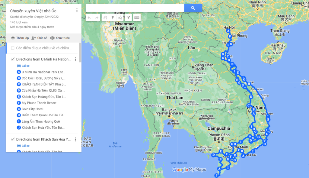 Lộ trình di chuyển xuyên Việt nhà mình[/caption]Tương tự với các điểm tiếp theo, map sẽ tự động vẽ đường đi cho bạn. Lưu ý là mỗi trường thông tin hiện nay google map mới chỉ giới hạn dưới 10 điểm nên phải tạo khá nhiều lớp. Map của mình tạo vài lớp đường chiều đi và đường chiều về sau đó tạo riêng 1 lớp là các điểm nhà nghỉ, điểm ăn uống. Cũng lưu ý là chỉ có khoảng 10 lớp thông tin được tạo mà thôi nhé. Cả nhà có thể tham khảo chi tiết danh sách các điểm mà nhà mình đi ở đây.