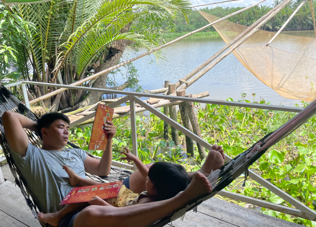 Là dạng quán nhà vườn nhưng lại có cái ao hồ nho nhỏ bên trong, chòi ăn nằm ven con sông nhánh đổ vào từ sông lớn Cổ Chiên. Vậy là bạn có thể tưởng tượng ra được cái độ thi vị mát mẻ của nó rồi đó. Sẽ không thất vọng bạn chút nào đâu nhé!