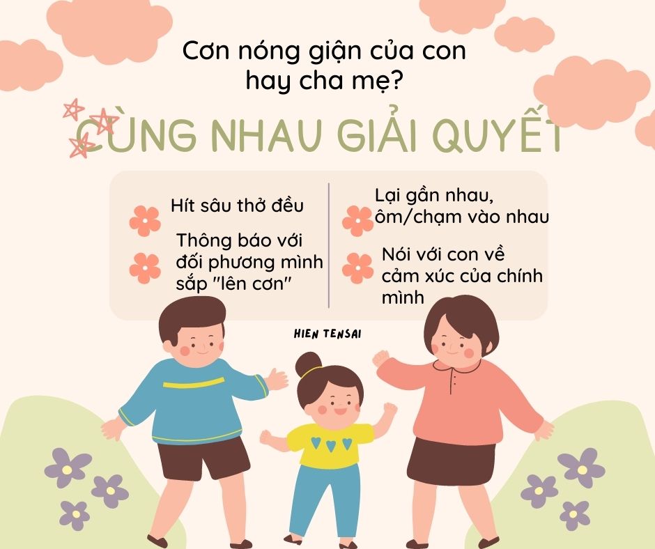 Cá nhân mình, khi mình nổi điên, mình cũng đều nói với con là mình sắp điên lên rồi, bởi vì cái lọ cái chai, tất nhiên ở một giọng nghiêm trọng hơn tông giọng bình thường một chút để con có thể nhanh chóng hiểu vấn đề. Mình cũng đề ra một quy định là khi đối phương “lên cơn” thì người kia cần có trách nhiệm giúp đỡ “hạ cơn” cho đối phương vì “hạnh phúc chung” của gia đình chứ không phải vì phạm lỗi hay làm sai mà phải có trách nhiệm. Bản thân bạn khi nóng giận, mọi giác quan, dây thần kinh đều đang bơm máu lên não với một tốc độ chóng mặt, có lúc khiến chính mình mù quáng, không biết phải giải quyết thế nào, vậy thì có 2 phương án:
