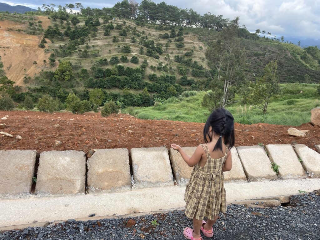 Đoạn gần chỗ vào quán cà phê trên đồi Bát Úp[/caption]Đồi khá đẹp và xanh, nhìn rất thích, không khí cũng vô cùng dễ chịu, trong lành và mát mẻ. Đi đường này không vướng bụi bẩn nên nhà mình toàn mở kính đi thò đầu hít hà (một phần cũng do trước đó trời mưa nên đất đã bị ướt không bị bụi lên). Trong này thì không có ai tranh đường với mình, vắng toe hoe. Tụi mình đứng chụp ảnh một lúc thì mới có hai anh đi làm nương rẫy về quần áo lấm lem tám chuyện bảo tụi mình mua luôn quả đồi mà chụp ảnh, các anh bán cho. Thấy các anh nói chuyện vui quá nên tụi mình cũng tiếp chuyện hỏi lại thì được các anh quảng cáo luôn về chỗ có vườn sầu riêng để vào thăm quan chụp ảnh ăn thoải mái, chỗ câu cá, chỗ view đẹp, săn mây túa lua. Nghe tới đây thì cả nhà mình nhảy vội lên xe đi luôn theo 2 anh về chỗ anh bảo “đẹp lắm, sầu nhiều lắm” (cũng hơi liều nhưng cũng vui kakaka.)